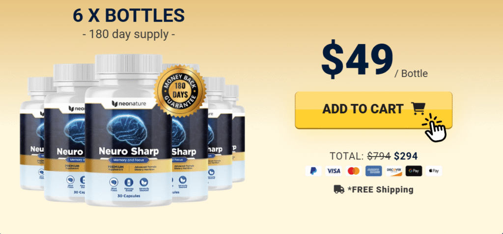 To ensure the authenticity and safety of your purchase, it’s highly recommended that you get Neuro Sharp™ exclusively from the official website. Right now, you can even enjoy up to 65% off on the 6-bottle package, saving up to $500.